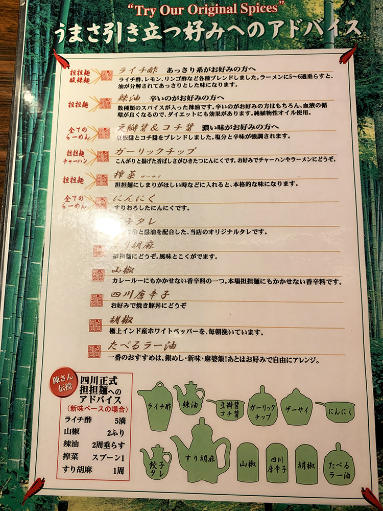 待っている間にメニューを見ていたら、新味と元味以外にも担々麺がありますやん。