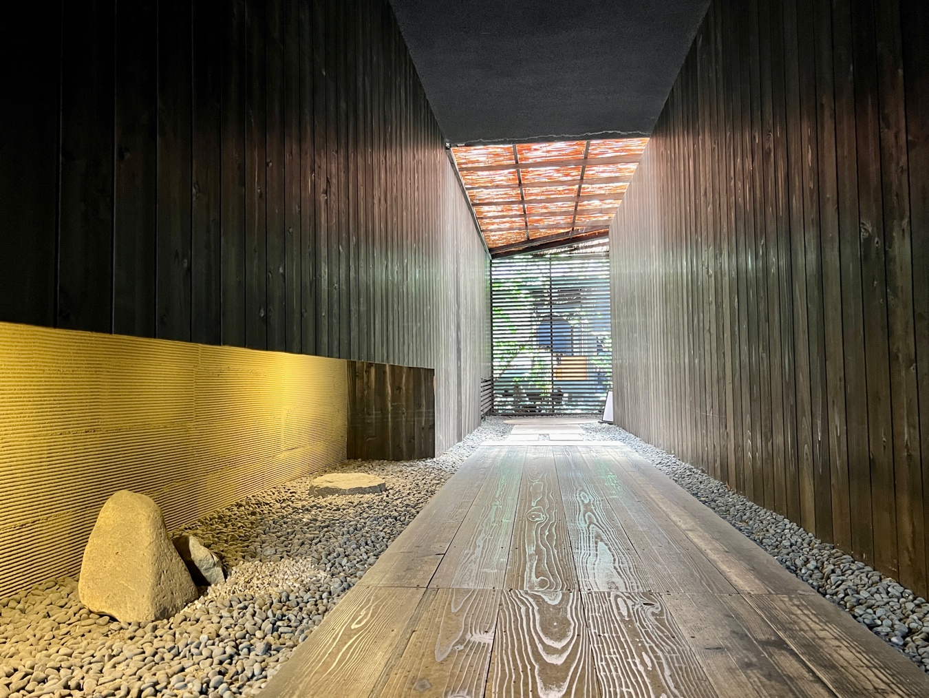 通路をずんずん進みまして、砂利と踏み石に格子といった和空間へ踏み入れていきます。