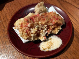続いて揚げ物です。レンコンとサツマイモの天ぷらに、海老のあられ揚げ。エビは少しカレーの風味が付いています。