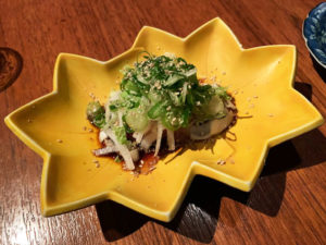 続いて、お造り。といっても、ポン酢がかけられ、上にたっぷりのネギがのせられています。料理の説明してくれたのですが、忘れてしまいました…。食べた感じではブリ。でもフグも入っていたような。魚も新鮮でおいしい。