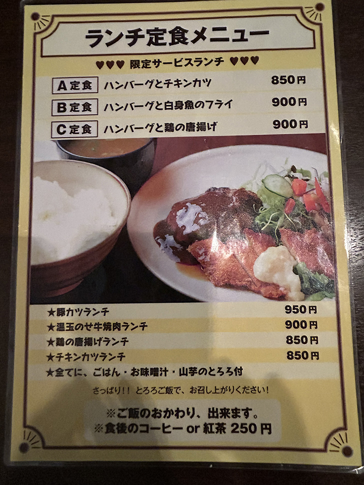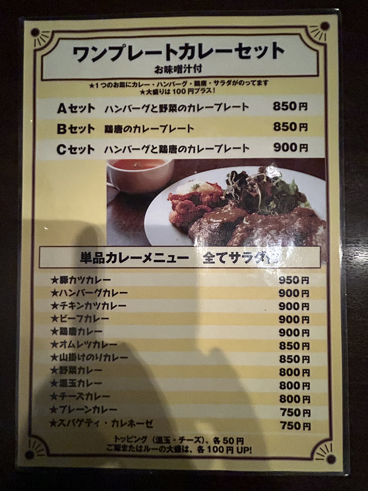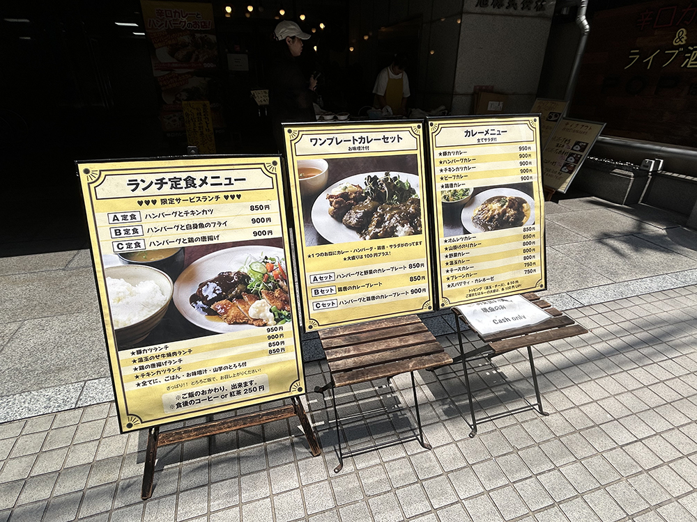 看板が出ていますが、カレーとハンバーグを中心に、定食、カレー、プレートなどがありますね。