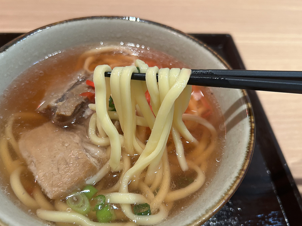 沖縄そばは、魚介のダシが効いておいしいです。