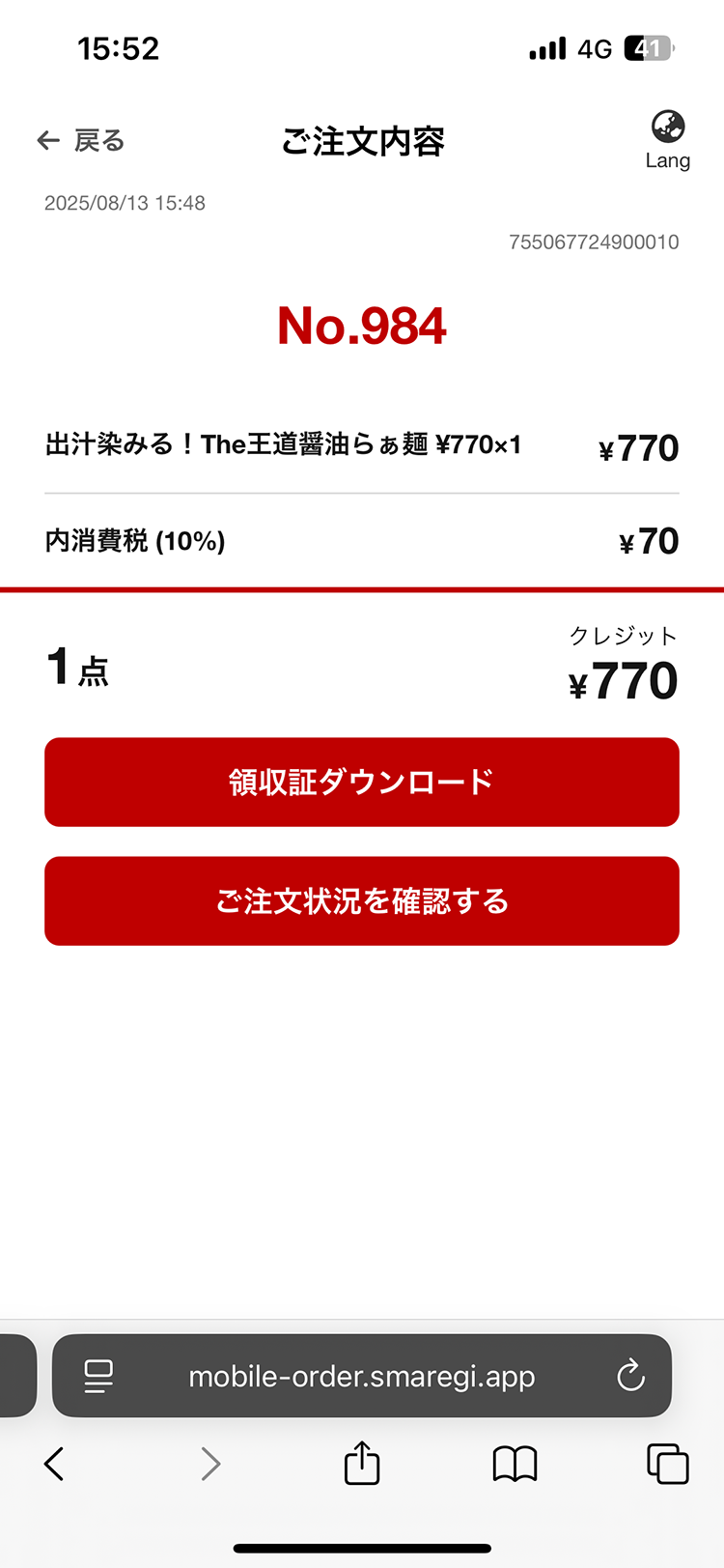 注文して支払いしたら、番号が出てきます。