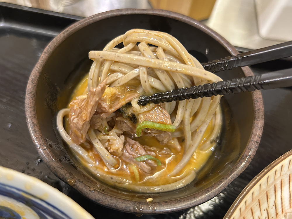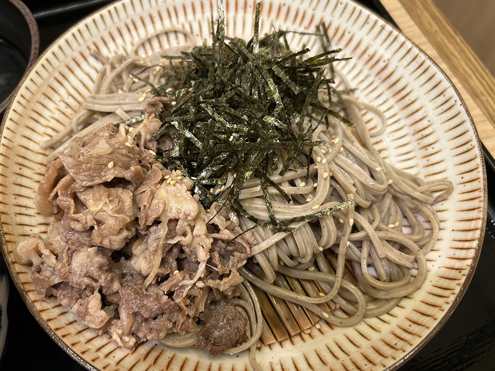そばの上に肉がたっぷり盛り付けられています!