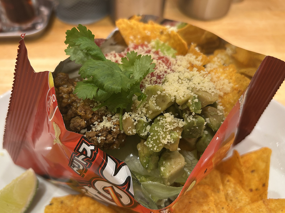 レタスのシャキッ、ドリトスのパリッ、ミンチのグニュッ、アボカドとトマトの柔らかさなど、いろんな味と食感が混ざり合って、うまいじゃないですか!
