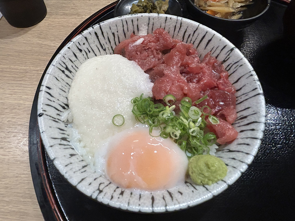 マグロの山掛丼は、たっぷりのとろろに卵が乗っています。