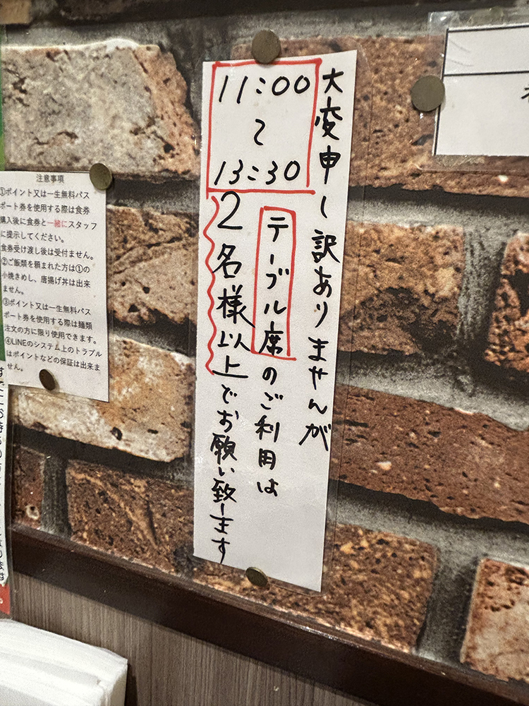 行ったのが15:00だったので2名テーブルに座らせてもらいましたが、13:30までは2名以上でないとテーブルの使用を控えてもらっているようですね。