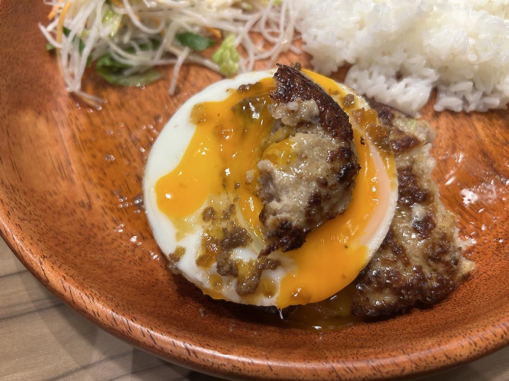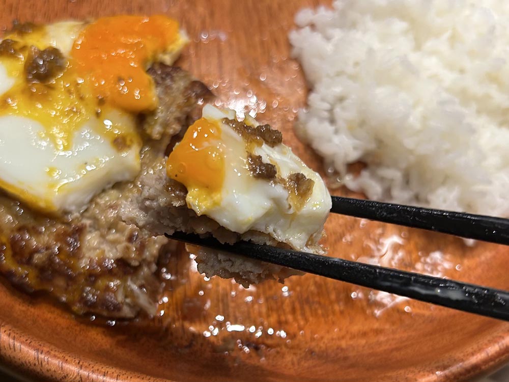 まずは黄身をつぶして、ハンバーグを絡めます。