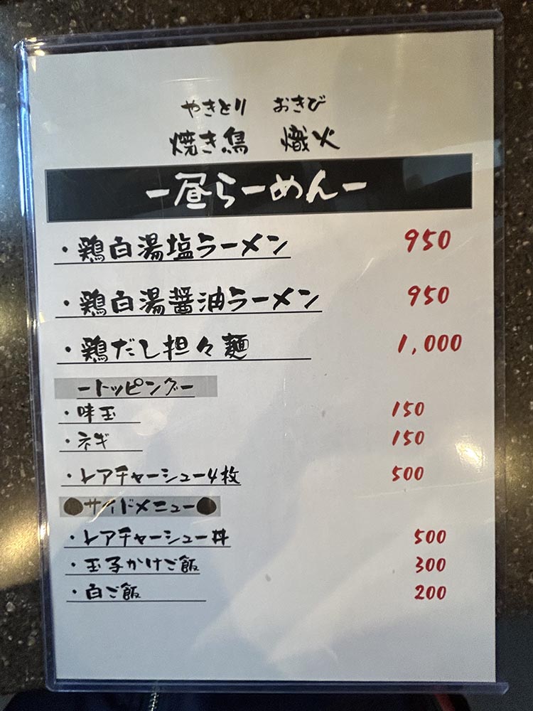 メニューはこんな感じで、鶏白湯の塩、醤油、担々麺があります。