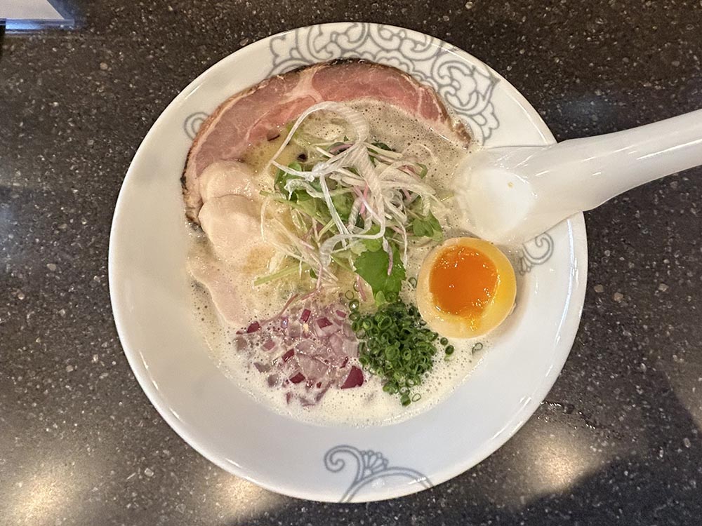 ネギやカイワレ、みじん切りの玉ねぎなどの野菜が入っていて、濃厚なスープの合間に食べると口の中がすっきりします。