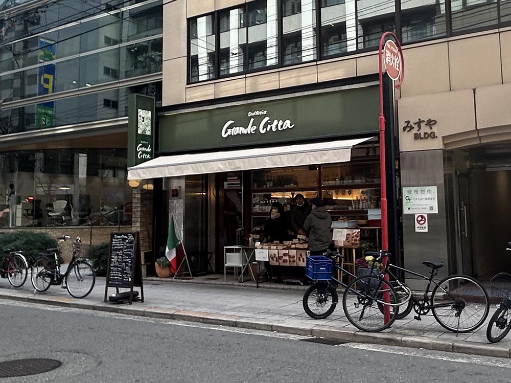 長堀橋でステーキを食べて淀屋橋の事務所に向かって歩いていたら、「グランデチッタ」の前でパンを売っていました。