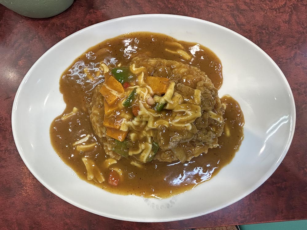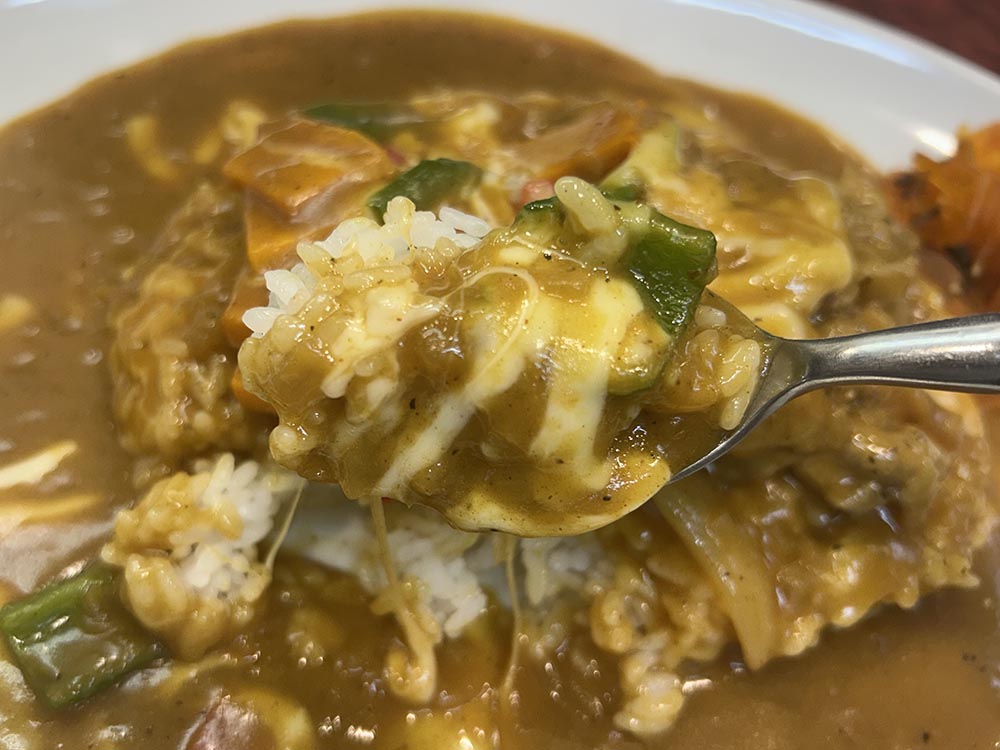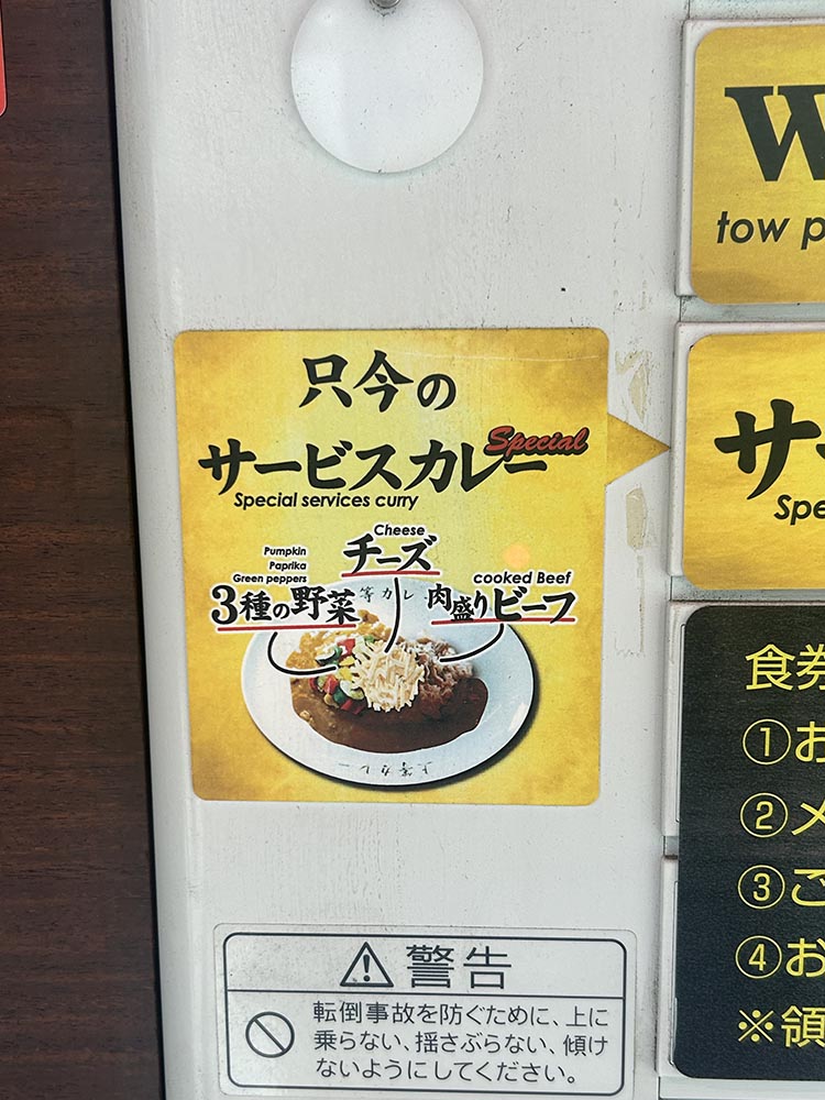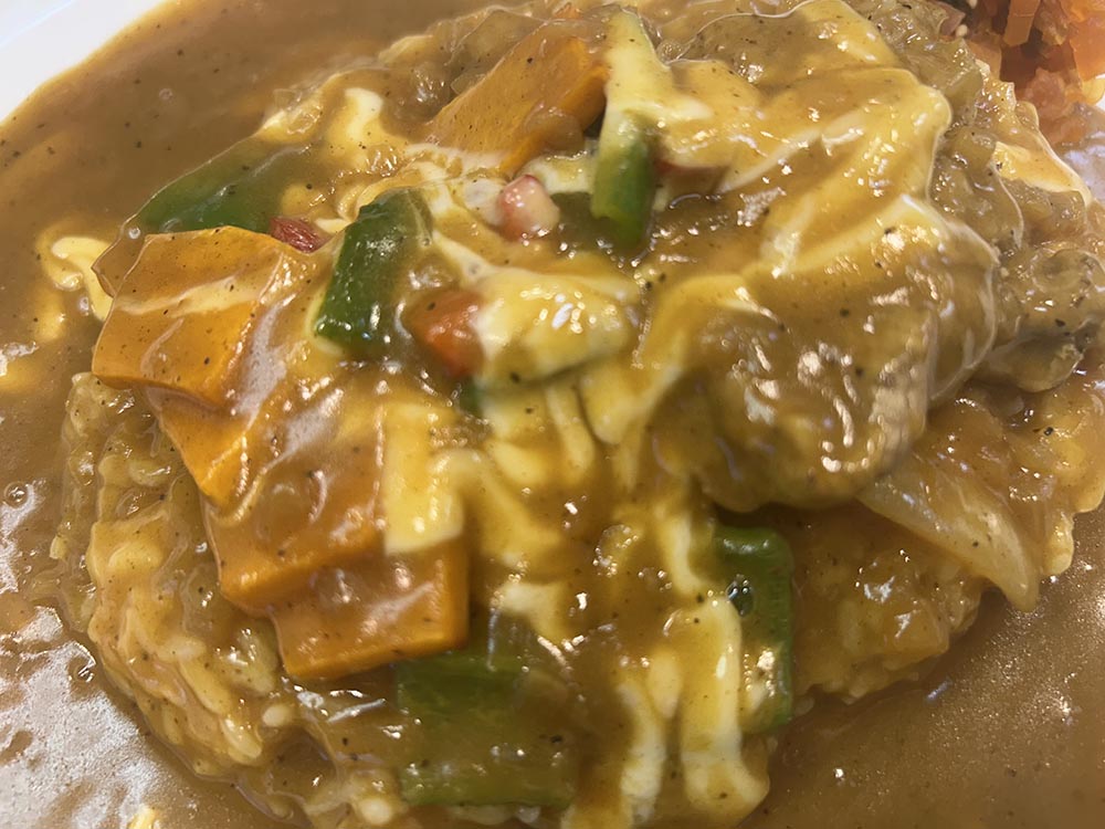只今のサービスカレーは3種の野菜、チーズ、肉盛りビーフです。