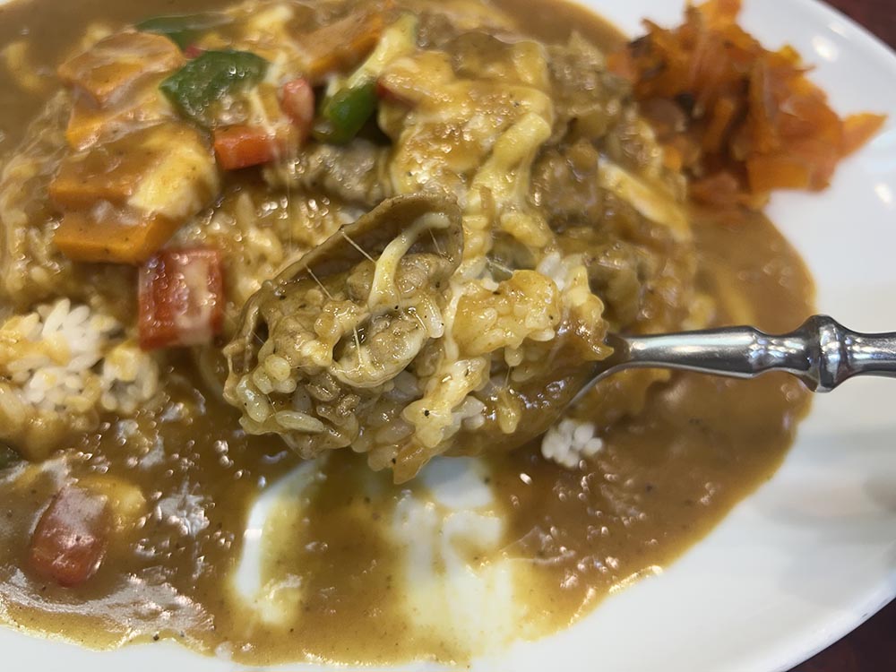 お肉はすき焼き風の甘めの味がついているので、カレーの辛さといい具合に融合しています。