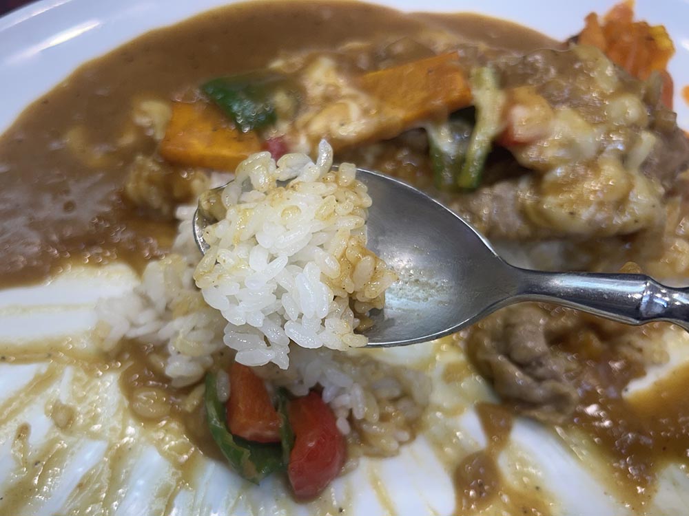 少し固めでコメが主張しているのに、カレーと一緒に食べると馴染んでくれる。