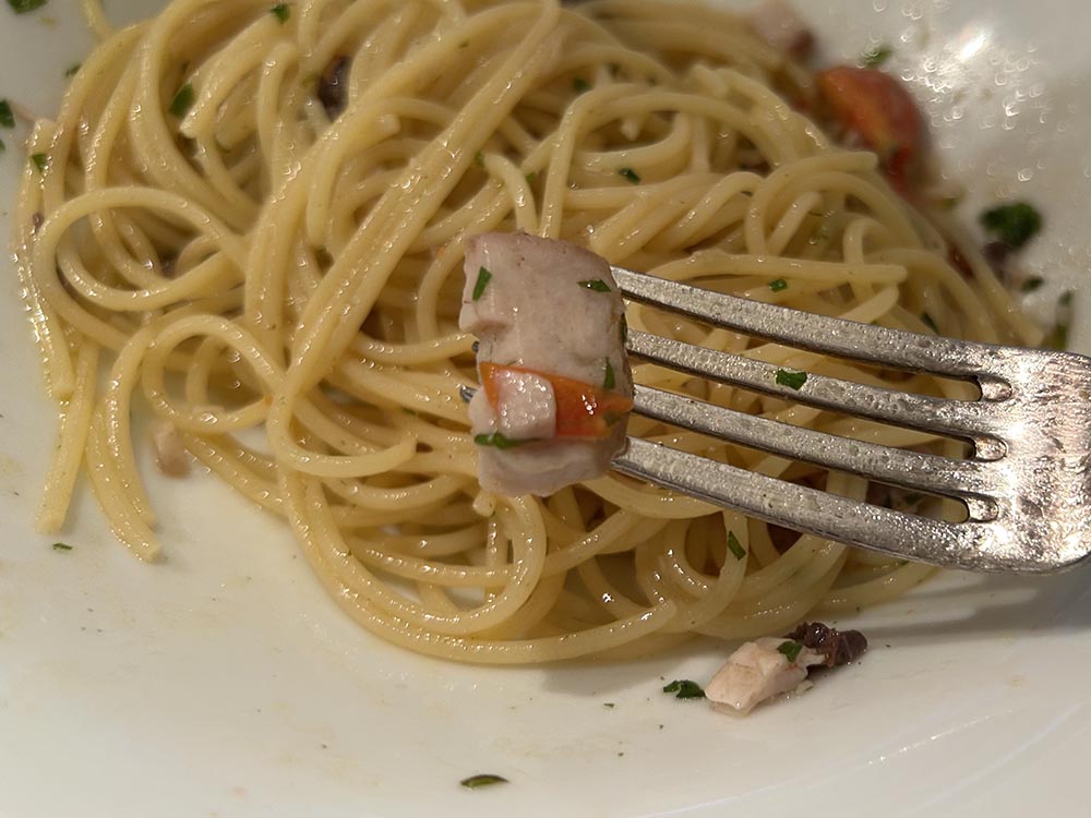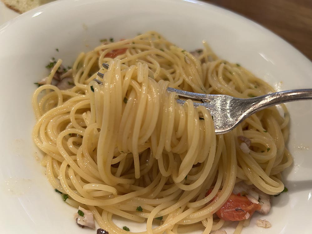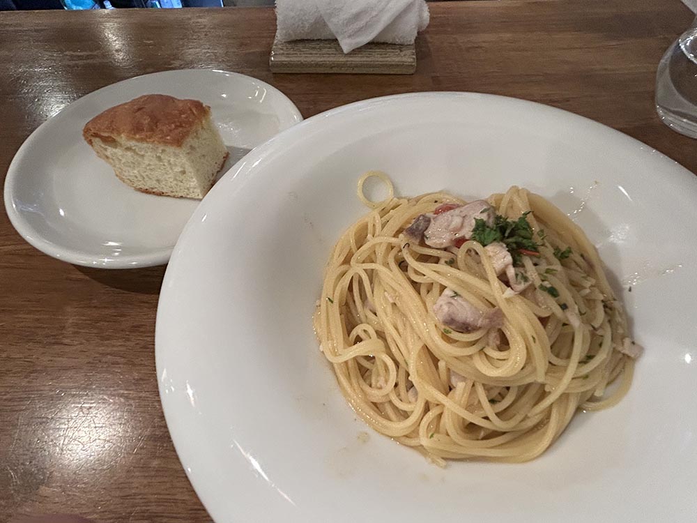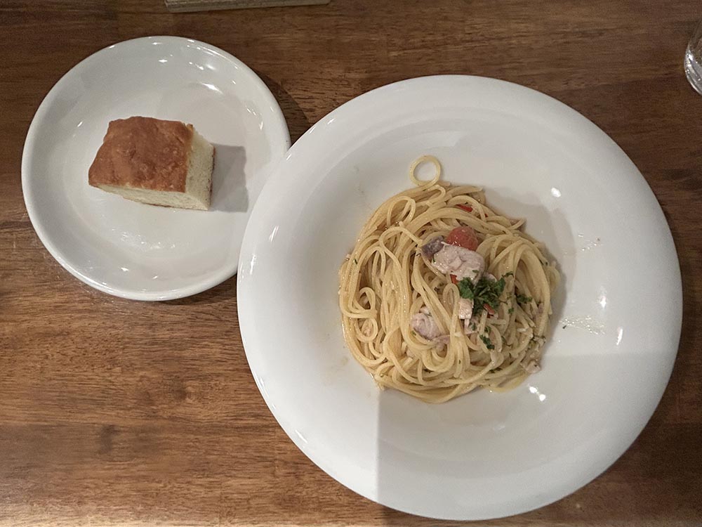 サラダを食べ終えたころに、パスタとフォカッチャが登場。