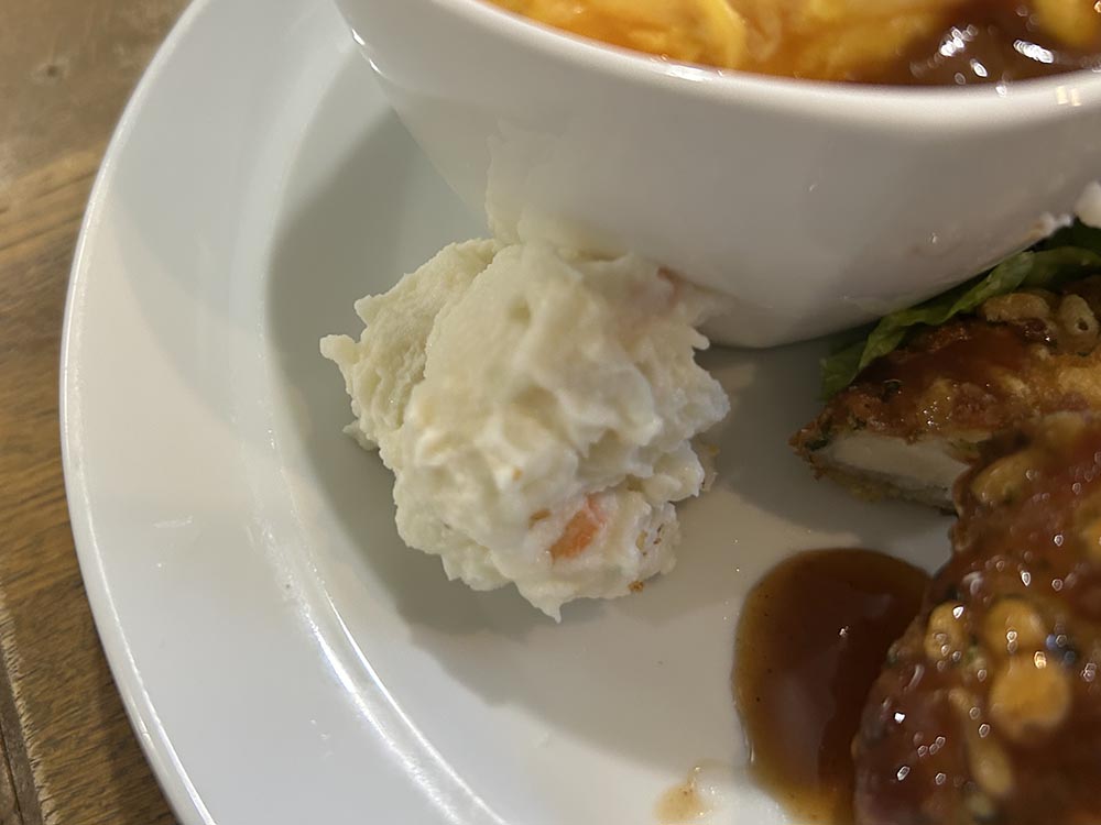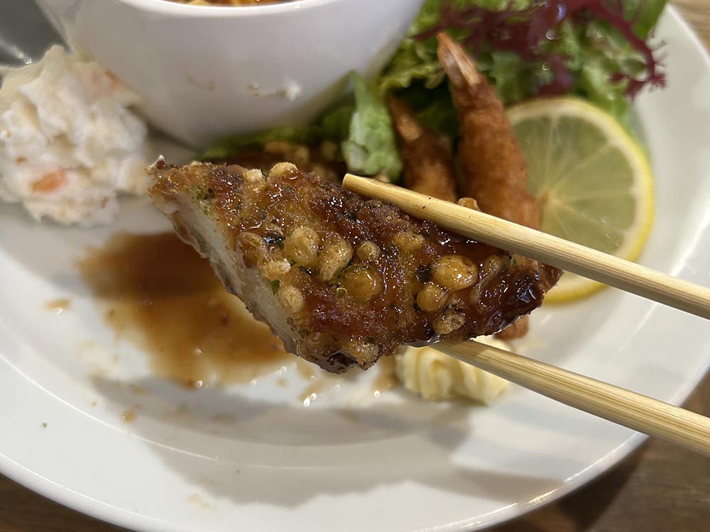 ヒトクチカツは、衣にあられのようなものを混ぜていて、サックサク!