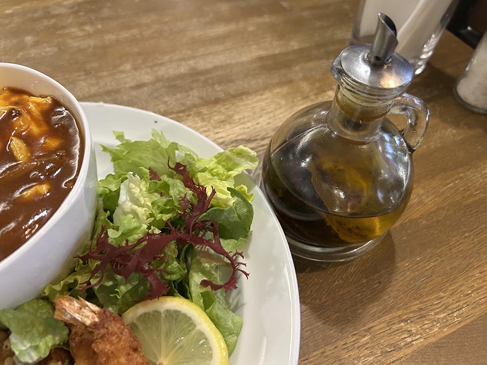 グリーンサラダにはテーブルにおいているオリーブオイルを使ってくださいとのことですが、オリーブオイルにハーブやスパイスを漬け込んでいるようで、これだけでおいしいドレッシングです。