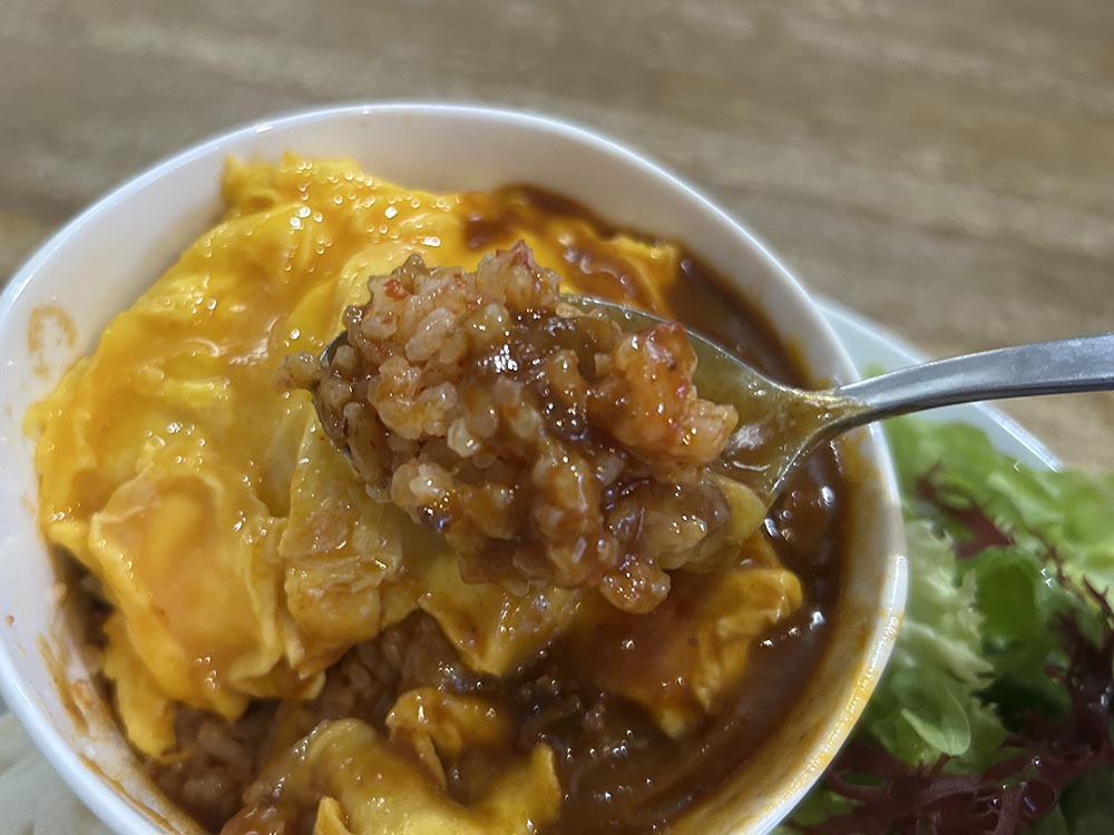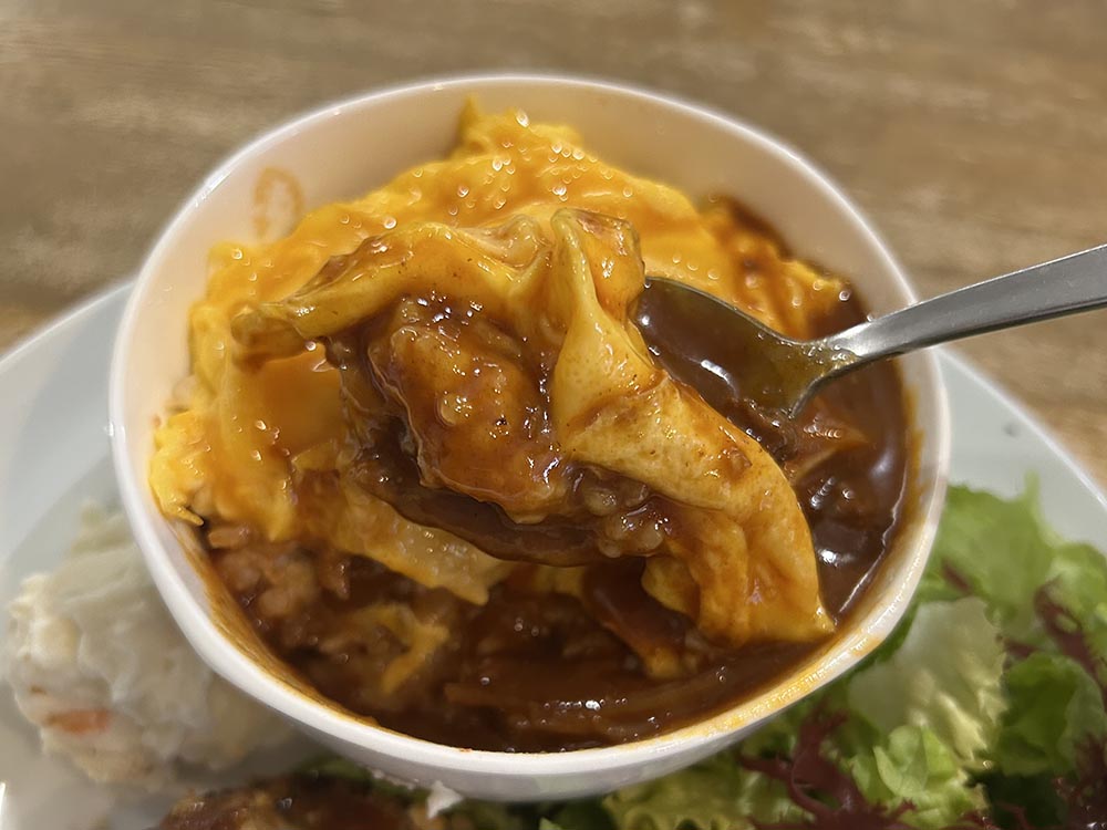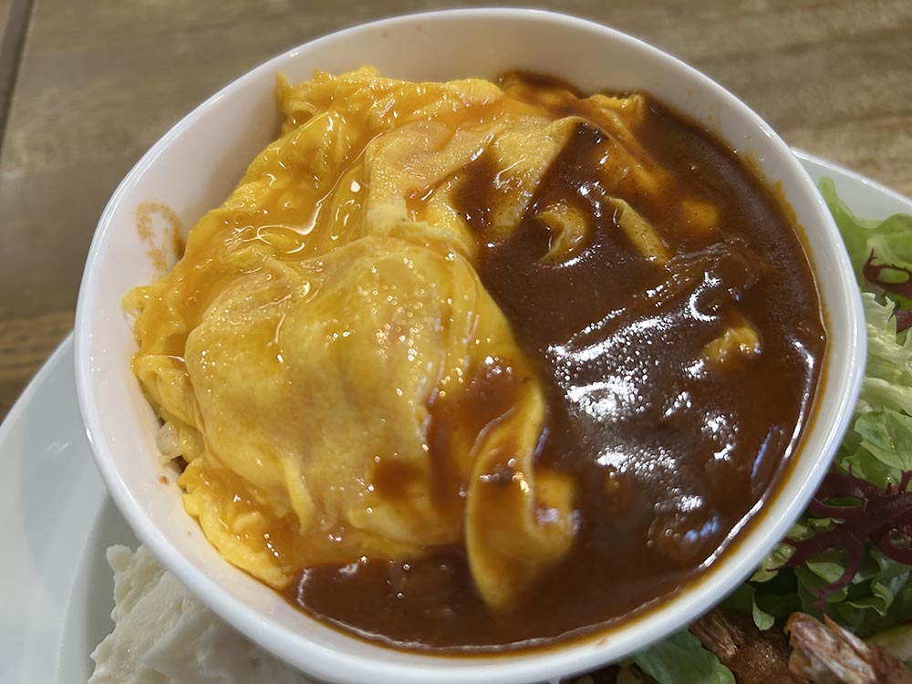 オムライスはどんぶりに入っていて、卵がとろとろ。デミグラがたっぷりかかっています。