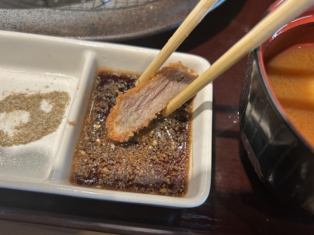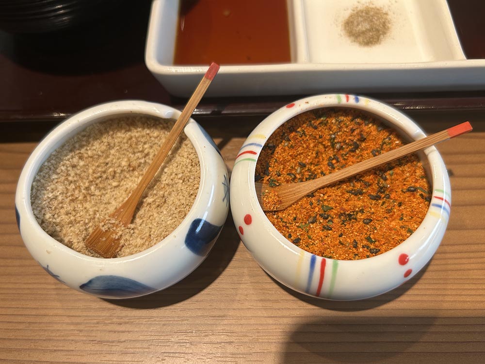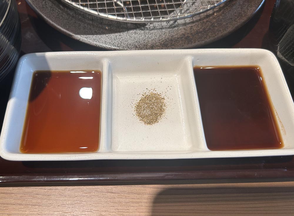 左からわさび醤油、山椒塩、牛カツソース、ですが、わさびがない…。