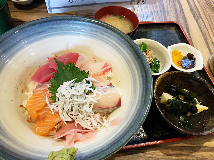 漁師丼は、ご飯3杯分くらいあるのではないか?というボリュームで、本日の海鮮は、マグロ、鯛、サーモン、ブリ(カンパチかも)、しらすです。たぶん